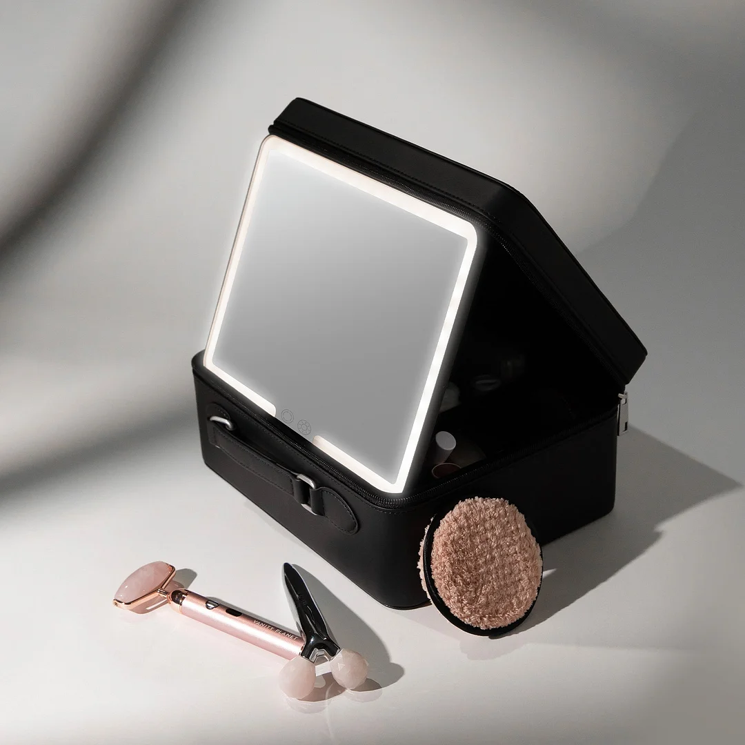 Store, organize, and travel with all your beauty essentials in our everything beauty bag, Baia. This portable vanity contains a large detachable tri-light, dimmable LED makeup mirror along with multiple compartments to store your makeup brushes, beauty devices, and various facial products. Ideal for travel, our spacious bag is the perfect keep-all for your beauty tech devices and makeup! Baia organizes and keeps your beauty must haves safe while traveling with a hard-shell exterior. The stretchy luggage strap on the back efficiently slides onto your suitcase for travel. This everything beauty bag allows you to do your full beauty routine anytime anywhere!